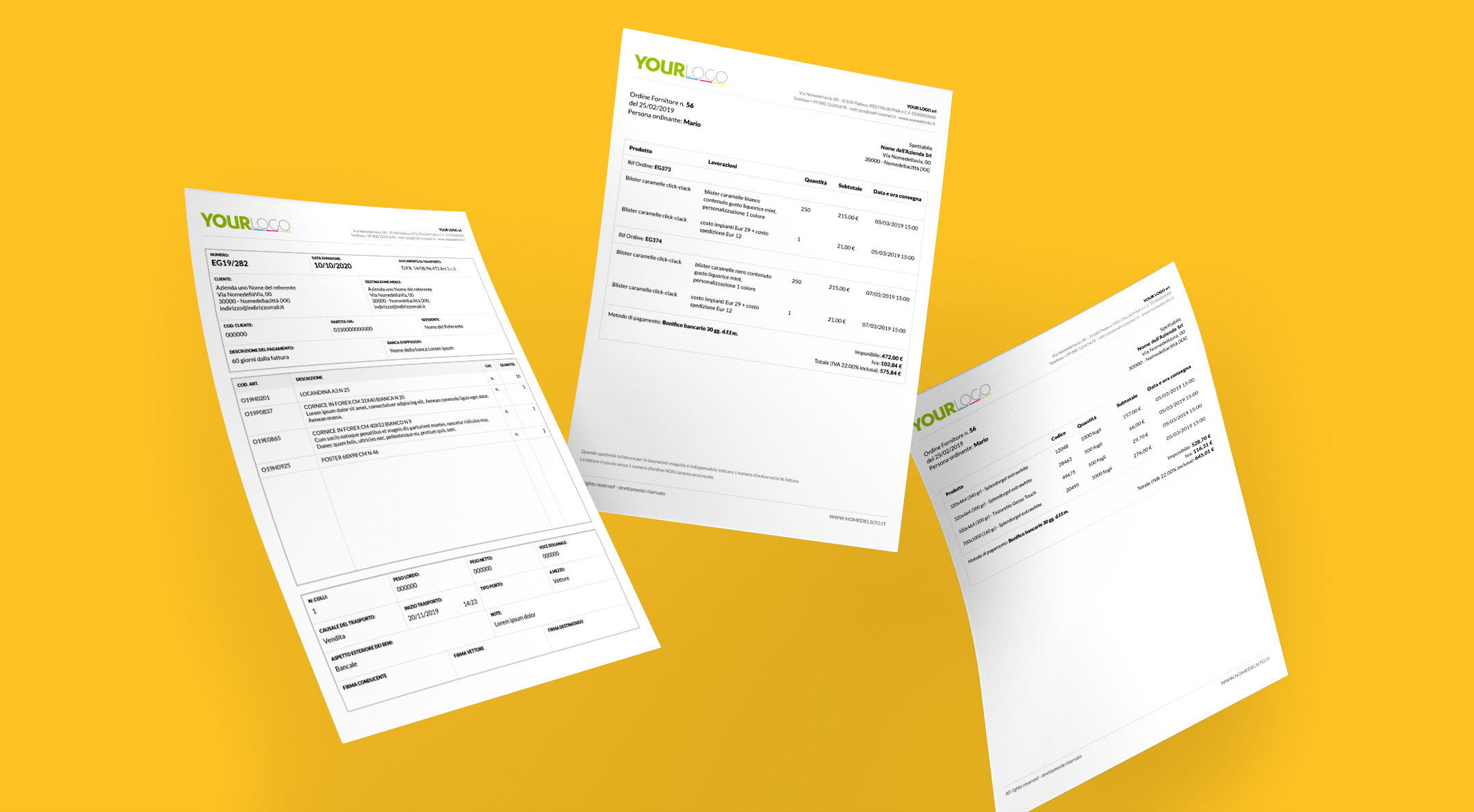 DDT di vendita: il sistema genera in automatico il Documento di Trasporto da consegnare al Corriere per la merce che viene venduta al cliente. DDT di conto lavorazione: il Documento di Trasporto per Ordini di acquisto lavorazione a fornitori esterni. Documenti d'Ordine: per acquisti di lavorazioni o materie prime da un fornitore esterno.