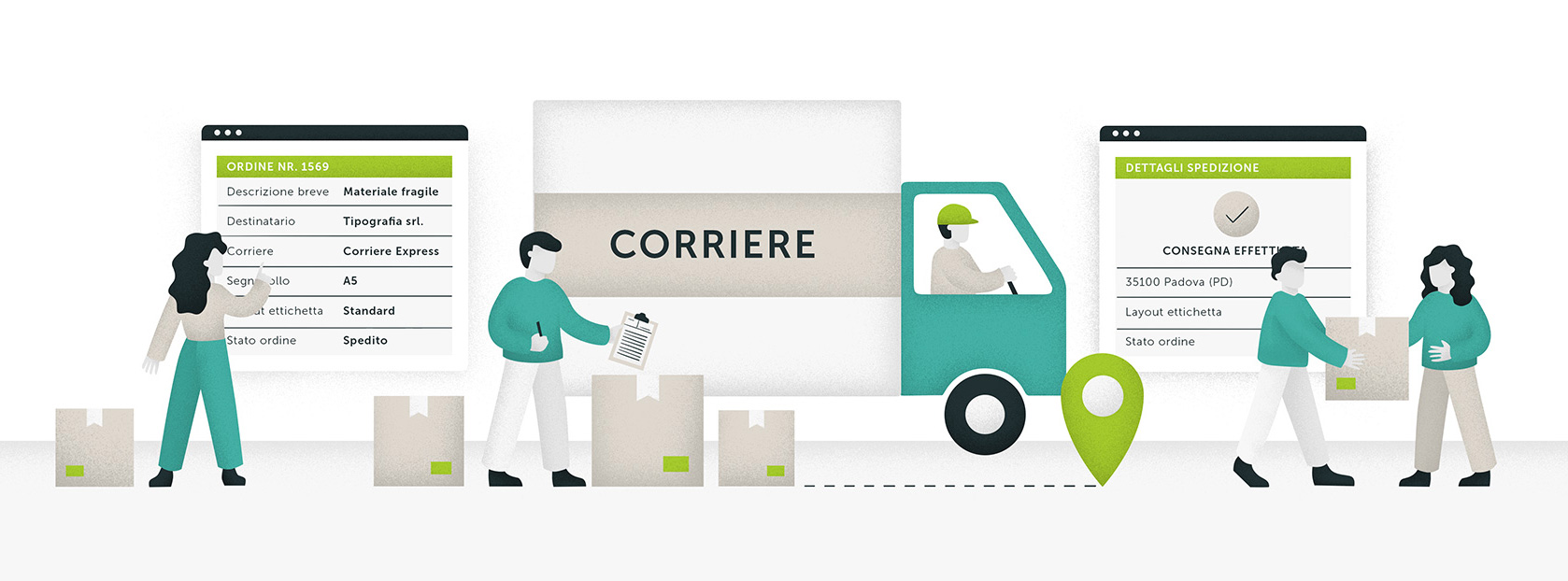 Se disponi del modulo Routing di Produzione, puoi organizzare il tuo Magazzino direttamente dalla piattaforma VG7. In particolare, hai la possibilità d' inserire e aggiornare le giacenze dei singoli materiali, monitorare il materiale che occorre ordinare, creare Ordini di acquisto al fornitore di materie prime, impostare avvisi di scorte in esaurimento. Il Modulo Corrieri permette l'interfacciamento del Configuratore Print con vari servizi di trasporto.